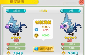 通过喂食可以提高精灵的等级与属性,我们还可以通过进阶的方式将精灵的星级提高,这样可以大幅增加精灵的战斗力,打破升级的瓶颈。3星及以上品质的精灵满级后,可以通过消耗相应材料和金币进行进阶。进阶后可以获得新精灵,并且精灵的品质会提升半星。