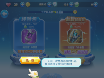 1、购买经验包可以获得强化图纸10个,经验点数9600,还可以随机获得一件装备,而购买超级经验包可以得到强化图纸120个,经验值99999点,并且随机赠送10件装备,这10件装备中最少有一件是S级装备。
