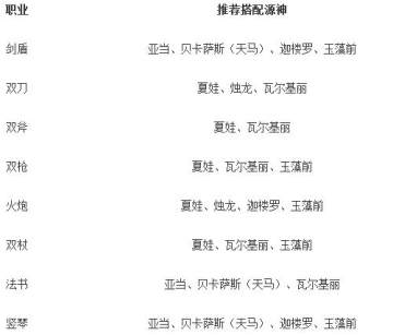 下表是依据各个职业跟源神之间的互补性,以及各个职业跟源神之间的连携技能效果来做推荐的。具体的还是让我们一起看看正文详细内容吧!