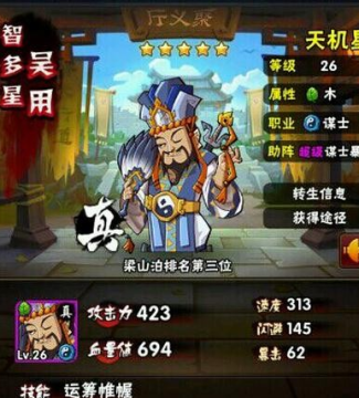 技能:当轮到自己出手时,对所有全体友将恢复相当于施法者攻击力50%的生命值,并施放加攻效果,提升25%攻击力,持续2回合。吴用的第一优势应该是加攻击,其次才是全体加血。战斗中,攻击才是王道,吴用居然能给每个队友加25%的攻击。