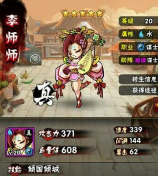 技能:当轮到自己出手时,对前排友将恢复相当于施法者攻击力80%的生命值。和李师师一样,都是奶前排,不过不如李师师,在没有更合适的奶妈时可过渡。