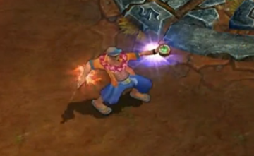 皮肤中的李青手里拿个椰子十分喜感,而Q技能的效果是把椰子扔到地方身上,W技能则是将椰子拍在地上,特效明显!