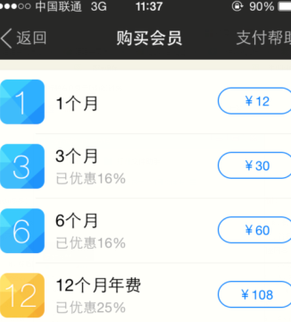 3、点击进入的画面为会员收费标准,分别有1个月、3个月、6个月、年费,根据您的需求购买会员日期便可以成功购买会员啦!