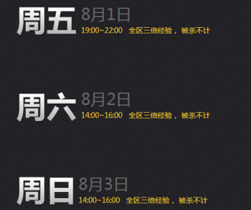 8月1日 19:00~22:00 全区三倍经验, 被杀不计