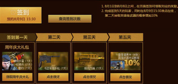 2. 完成签到5天的玩家,同时在8月9日15:30准点在线,第二天抽取英雄级武器的概率增加10%