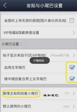 3、勾选文字小尾巴,然后添加小尾巴。你也可以设置,楼中楼回复带尾巴,这些你都可以随意设置,如图所示。