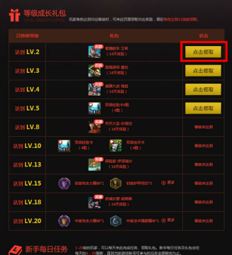 新手成长礼包分为”等级成长礼包“和”新手每日任务礼包“。