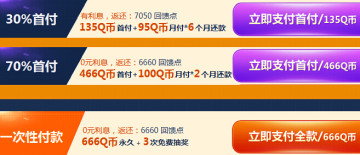 1、套餐分3种,分别为首付135Q币套餐、首付466Q币套餐和全款666Q币套餐。回馈点将在您每次支付后,分期返还。