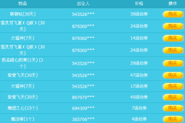 2、在交易行每出售1个道具或修改一次道具价格需要消耗1活动券(1活动券=1Q币),每位用户最多可同时在交易行中放置5个道具, 交易行中的道具需要通过活动券进行购买;