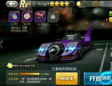 这辆r级车从造型上来说,应该会引起很多玩家的注意,因为小编感觉是目前造型最有范儿的赛车了,那车头那尾翼,估计很多玩家很独宠,而且这辆r级车D-knight属性技能还不错,在r级车中挣扎不知道入手哪辆的小伙伴们,可以考虑入手一辆来试试手感,相信要破记录问题不是很大。