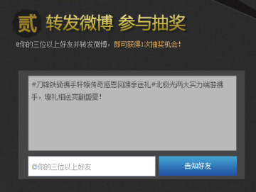 2、转发微博,参与抽奖。@你的三位以上好友并转发微博,即可获得1次抽奖机会!