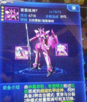 雷霆战神Y由神魔异形max和智慧曙光max合成,等级75,分数加成89%,攻击力高达6718,它拥有特技日烈贯射和暗影裂刺,推测这两个技能就是贯穿和散射的加强版。雷霆战神Y可以同时具备2种攻击模式,两种攻击模式的能量圈充满的时候,可以相互切换攻击状态。听说切换攻击状态cd长达30s,但是贵族玩家可以略微减少切换cd哦。
