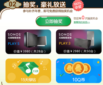 4、普通用户或普通绿钻用户参与补齐成功后,可获得1次免费抽奖机会;年费绿钻用户可获得3次抽奖机会,获更多奖品!您可能随机获得SONOS PLAY:5、SONOS PLAY:3、15天绿钻或10Q币,100%中奖!