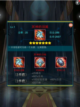 7星套装翼神共有3件,分别为翼神之石,翼神的图腾,翼神的羽翼。