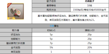 丹青骰子上线啦,尊享特殊能力建设费用打折优惠7,单双奖励1,整体附加能力23!
