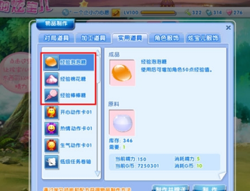 经验泡泡糖、经验棉花糖(可通过炫宝儿技能进行制作)