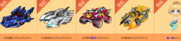 S车猛兽(15天/30天/永久)、S车麦凯伦(15天/30天/永久)、A车钢铁雷诺(30天/永久)、A车黄金针尖(30天/永久)、美人鱼(永久)