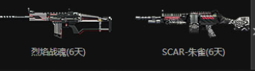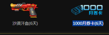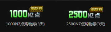 黑龙霰弹枪(6天)、Z型补给站(6天)、1000NZ点购物券(3天)、2500NZ点购物券(3天)、百炼钢管(6天)、DE虎鲨(6天)、烈焰战魂(6天)、SCAR-朱雀(6天)、猎魔执照(6天)、M4A1-绝影(6天)、沙漠汗血(6天)、1000月券卡(6天)