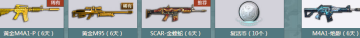 黄金M4A1-P(6天)、黄金M95(6天)、SCAR-金蝰蛇(6天)、复活币(10个)、M4A1-绝影(6天)