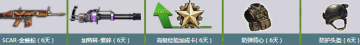 SCAR-金蝰蛇(6天)、加特林-紫骍(6天)、高级经验加成卡( 6天 )、防弹背心 ( 6天 )、防护头盔 ( 6天 )