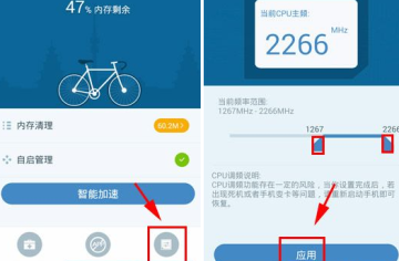 1、打开手机加速,选择【CPU调频】;根据所需设置CPU主频,最后点击应用即可。