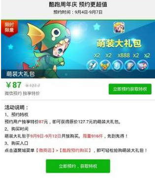 预约用户独享特价87元,即可获得原价127.7元的萌装大礼包;