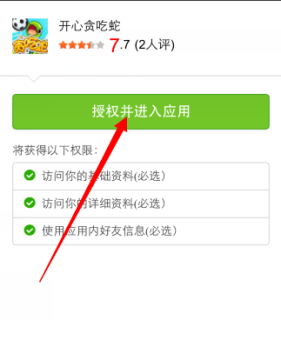 3、接下来便出现了授权并进入应用的文字,点击即可在此游戏收藏在自己的玩吧里啦。需要注意的是,授权以后你的资料以及好友信息都会被公开。