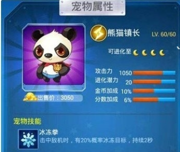 宠物技能:冰冻拳。击中敌机时,有20%概率冰冻目标,持续2秒。