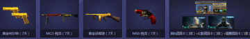 黄金柯尔特(7天)、MG3-翔龙(7天)、黄金汤姆逊(7天)、M66-翔龙(7天)、仇道具卡(1张)+幻影道具卡(1张)+雷霆道具卡(1张)