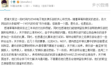 作者:qqtn小天 人气:0WE俱乐部官方微博于北京时间2014年9月9日,中午2时许发布长微博,文中表示了对WE粉丝的感谢以及对WE俱乐部未来的展望。面对WE草莓与微笑的退役,WE的CEO小兽提到“各大网站的头条都用”一个时代的终结”作为标题。但就像一个圆,是终点,也是起点。