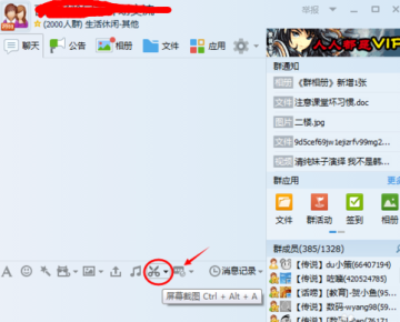 1、登录QQ,打开聊天对话框,找出截图工具,如图所示。