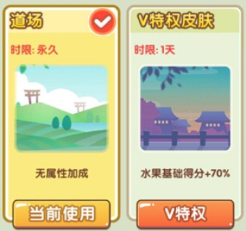 PS:大家不要小看了场景皮肤,这是只有V特权才能享受到的待遇,现在只有阳光海景、浪漫樱花两种(道场场景是免费,没有任何加分)还不只是看起来美美的哦,它可以进行水果基础加分高达70%。
