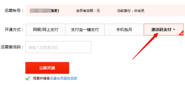 9、开通方式点击其他方式后再选择激活码支付,并输入微信上提供的迅雷激活码,需要注意的是大小写需分开,不然会显示错误的哦!