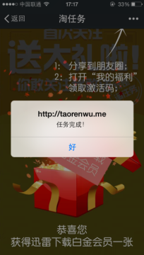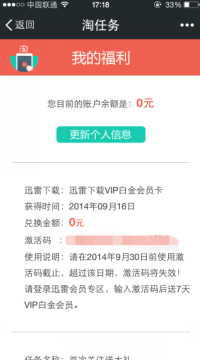 作者:qqtn强柔 人气:0微信关注淘任务并将此活动分享至朋友圈即可获取迅雷白金会员7天体验资格,只不过体验资格是需要大家使用激活码兑换的,具体操作流程小面将在本文详细介绍,希望能够帮助大家。