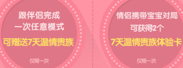 1、跟伴侣完成一次任意模式可赠送7天温情贵族