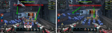 后路开始安放2自修2切割,2电墙。到第7关结束,金钱可以升级3级自修,并在后路出口左侧间隔安放4-5个电墙,如图左所示:第8-9关2自修,2-3切割6-7个电墙足够满足打怪需求,在这两关中可以留意存余金钱,到第9关结束时一般可剩余3W+金钱,如图右所示,小编9关结束时余钱3W+,果断将地刺陷阱换成机兵升级到哨兵,后置安放,10关一开始就可安放15挺机枪哨兵。
