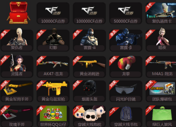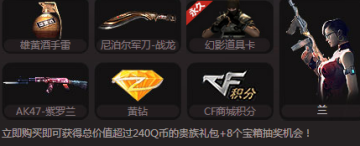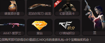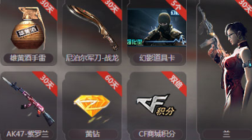 雄黄酒手雷、尼泊尔军刀-战龙、幻影道具卡、AK47-紫罗兰、黄钻、CF商城积分