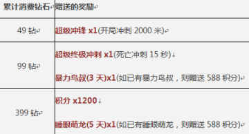 活动内容:活动期间,小伙伴们累计消费钻石达到以下额度,可以立即获赠相应额度的礼包哦!(注:活动期间,不同日期消费的钻石可以累加;每档礼包只能获得一次)