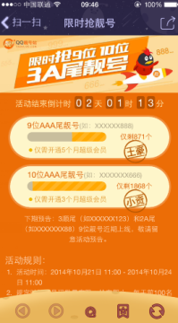 作者:qqtn强柔 人气:0QQ靓号站限时抢AAA级靓号活动很给力,只需扫描二维码即可进入QQ靓号里抢购9位数或10位数的4A尾靓号,每天前100名抢单成功用户可额外获得赠送超级会员1个月哦,活动数量有限,先到先得哦!