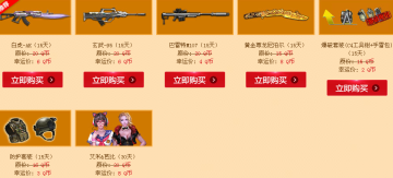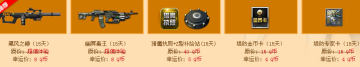 白虎-AK(15天)、玄武-95(15天)、巴雷特M107(15天)、黄金尊龙尼泊尔(15天)、爆破套装(C4工具钳+手雷包)、防护套装(15天)、艾米&芭比(30天)