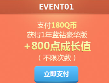 1、本活动页面支付180Q币,即可获得1年蓝钻豪华版和800成长值,参与次数不限。