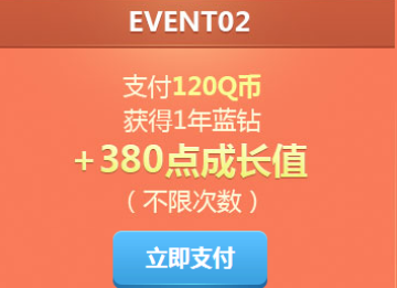 2、本活动页面支付120Q币,即可获得1年蓝钻和380成长值,参与次数不限。