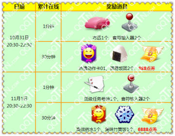 11月1日,20:30-22:30累积在线1分钟和30分钟即可领取6888点券+体力恢复药剂+珍品道具。