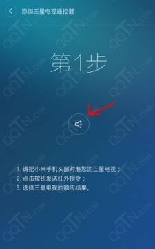 6、这时将手机头部对着电视机,然后点击下图中箭头所指的类似铃铛的图标,查看电视是否有反应