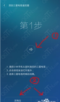 7、点箭头所指的类似铃铛的图标后,会出现“无响应”和“有响应”假如电视有反应就点击”有响应“,假如没有反应就点击”无响应“