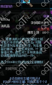 DNF玩家可以在NPC梦幻列车长拉宾处花费8个时间碎片购买陈旧的锁,需要消耗3个陈旧的解放之匙才能打开该物品。打开后,可随机获得列车乘客的行李,列车乘客的首饰,小型深渊宝珠,+7装备强化劵,遗忘河之水和装备品级调整箱等物品中的其中一件!