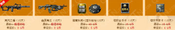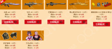 白虎-AK(15天)、玄武-95(15天)、巴雷特M107(15天)、黄金尊龙尼泊尔(15天)、爆破套装(C4工具钳+手雷包)、防护套装(15天)、艾米&芭比(30天)