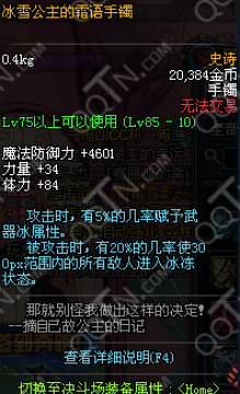 DNF冰雪公主的霜语手镯攻击时,有5%的几率赋予武器冰属性。被攻击时有20%几率使范围内所有敌人进入冰冻状态!