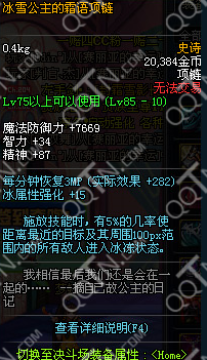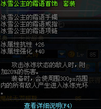 DNF冰雪公主的霜语项链冰属性强化加15,施放技能时有5%几率使被击中的目前周围范围内的所有敌人进入冰冻状态