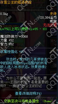 DNF冰雪公主的霜语戒指冰属性强化加15,攻击时有2%几率使被击中的目前周围范围内的所有敌人进入冰冻状态,效果持续2秒!
